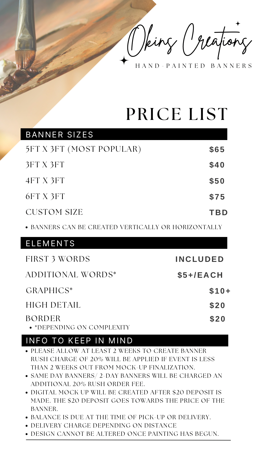 Banner Pricing subject to change. Detailed elements will increase the price of the banner. Invoice will be sent and agreed upon before deposit is due. Full payment must be made before pick-up or delivery.